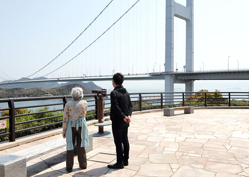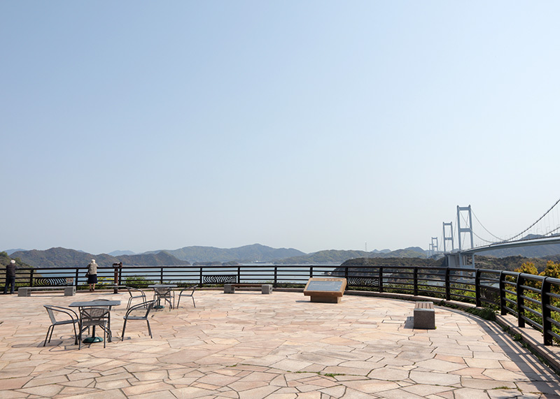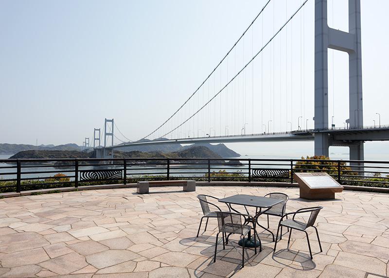 日本三大急潮の一つとして知られる来島海峡とカメラにおさまりきらない大きさの来島海峡大橋が目の前に広がります。